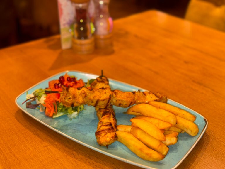 3 Lamb skewers served with choice of rice or chips
