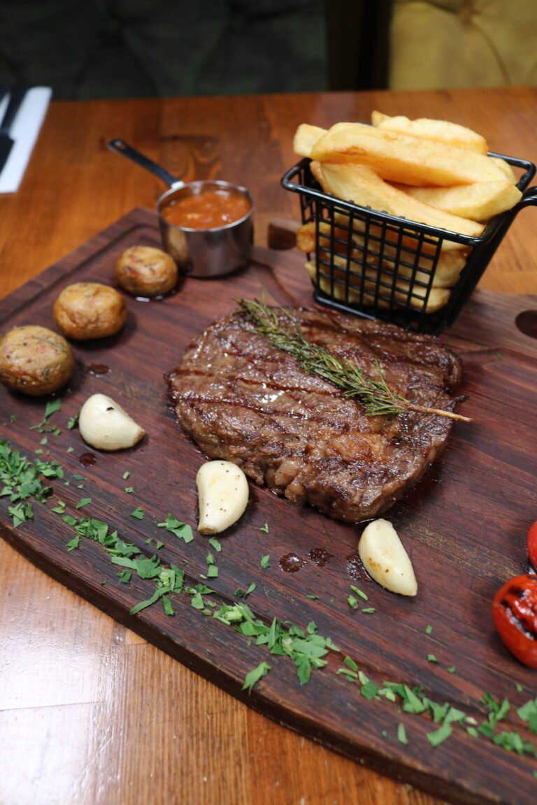 Prime tender and juicy straight from the grill, served with chips and mushrooms