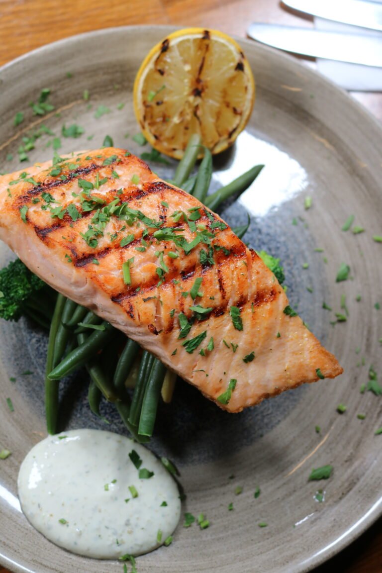 Pan fried Salmon marinated with olive oil, lemon butter sauce served with steam vegetables and baby potatoes or chips
