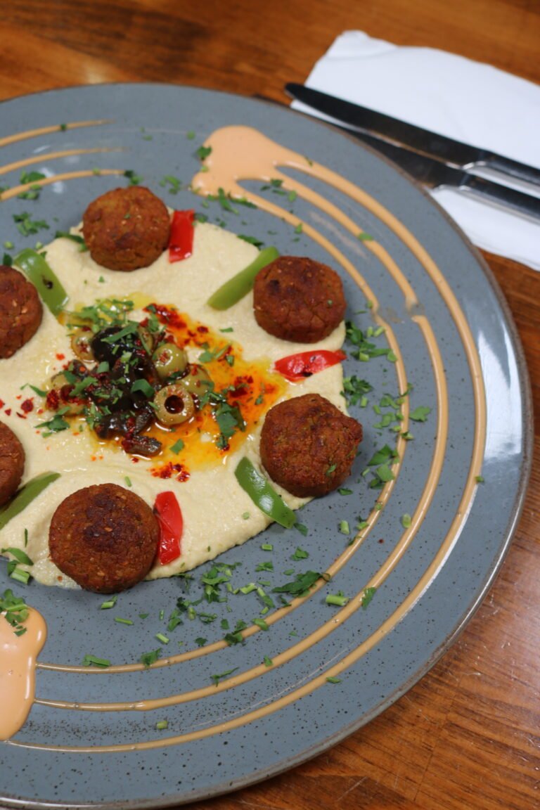 Homemade Golden fried Falafel on a Bed of Hummus, served with choice of rice or fries